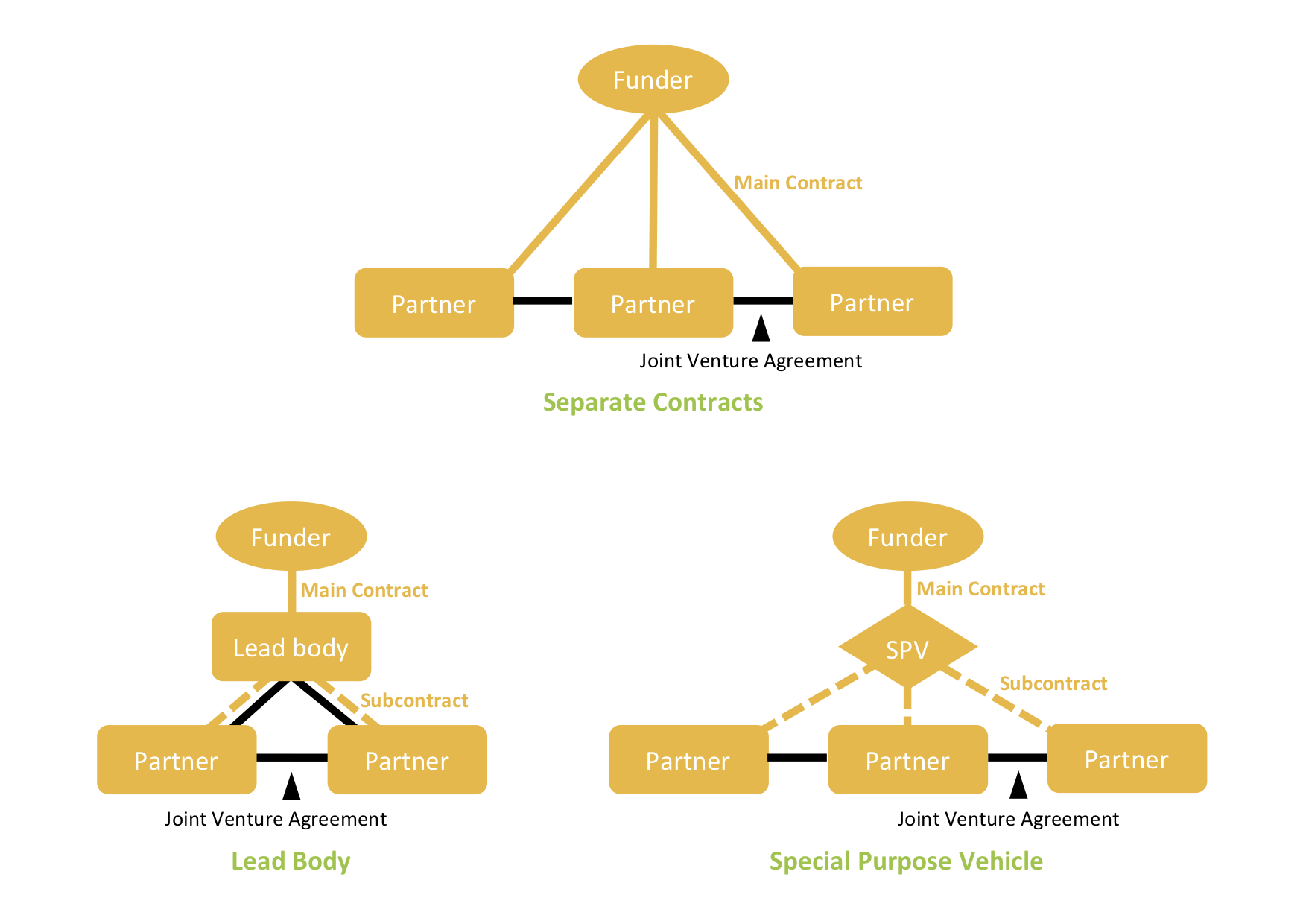 There are broadly three types of consortium structure: separate contracts (each partner has a separate contract with the funder), a lead body (one partner is the lead contractor and subcontracts to the others) or a special purpose vehicle (SPV - a new organisation is set up as the lead contractor and subcontracts to the partners). These are illustrated in the diagrams below.