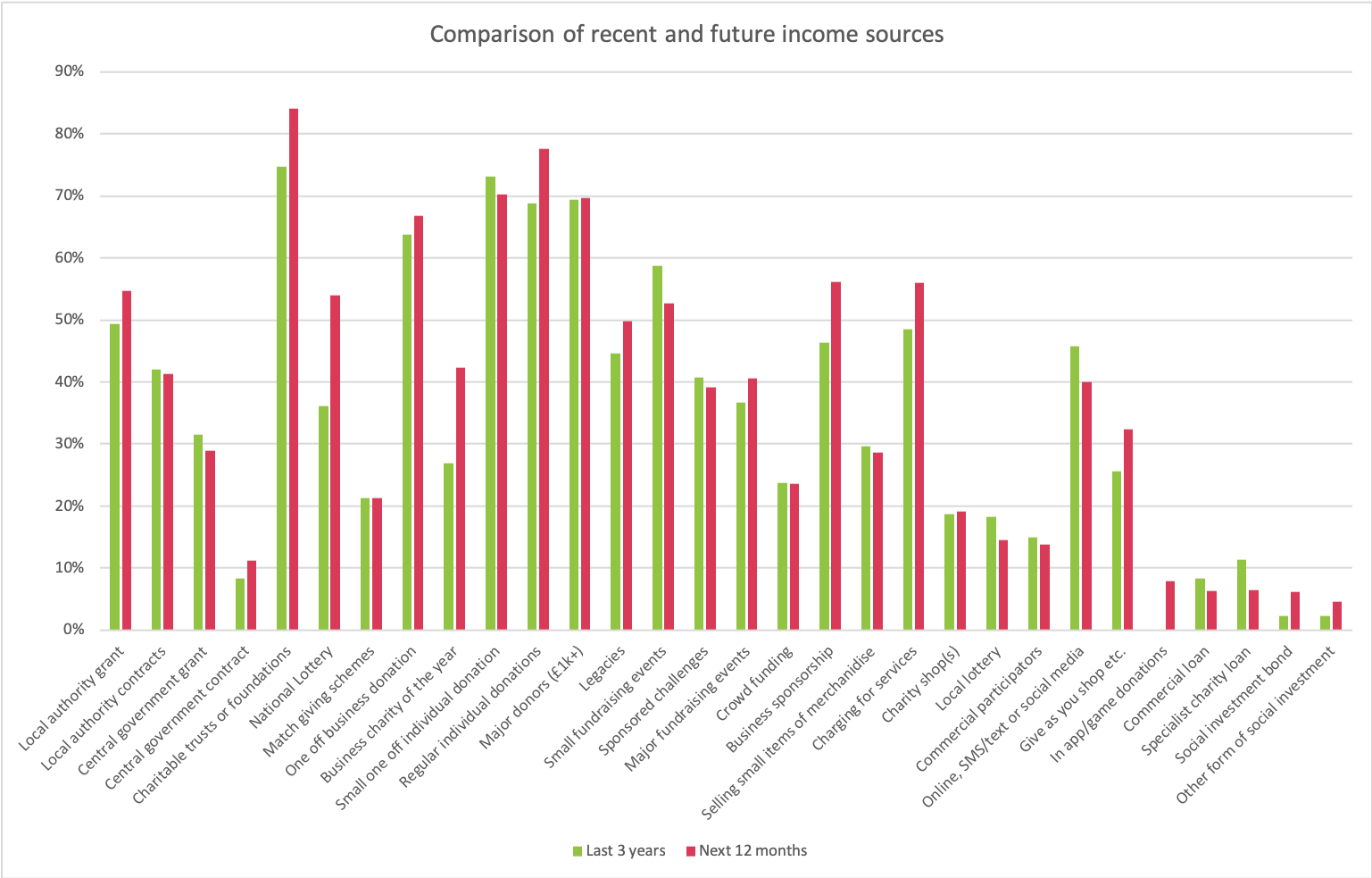 The most common income sources were trusts and foundations, individual giving and one-off business donations, with a significant proportion also receiving income from local authorities, through events, legacies and earned income. Delegates appeared to be embracing digital giving platforms of various types (although many had yet to do so) but very few had ventured into social investments/loan funding (perhaps unsurprisingly for audiences comprised mostly of small and medium-sized charities).