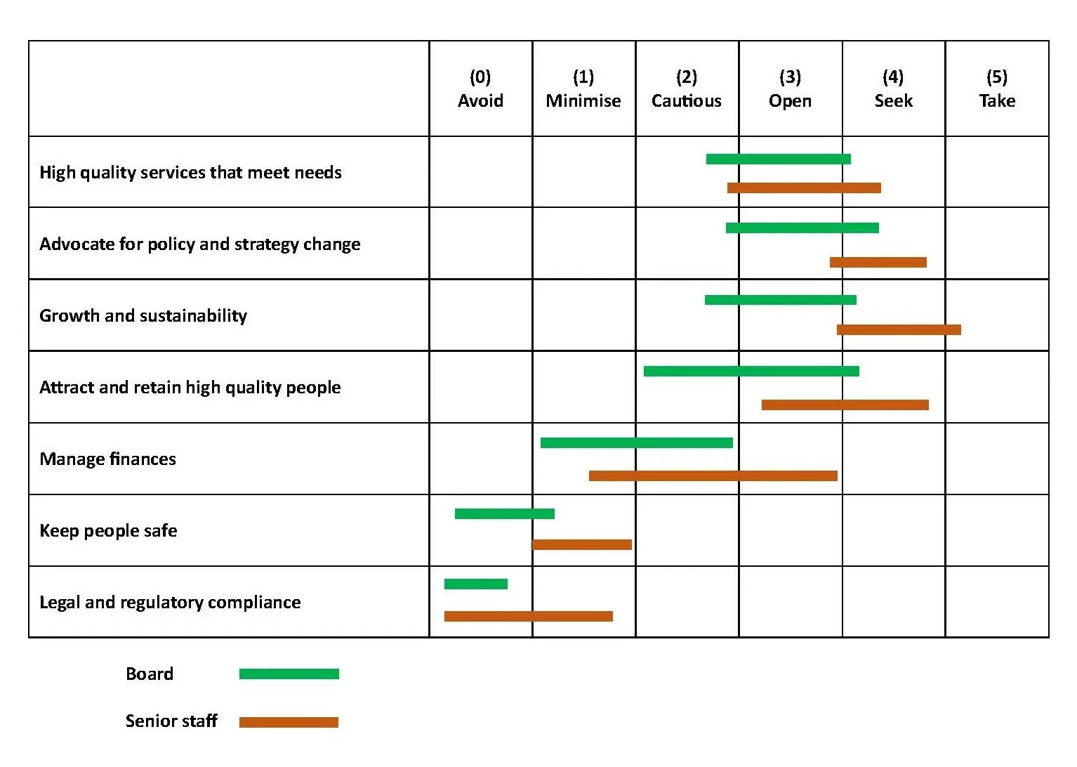 One useful approach can be to explore the risk appetite of each member of the Board and the senior staff team for each of the identified risks associated with delivery of each of your strategic objectives. In each case the risk appetite (or stance) could be described as follows: