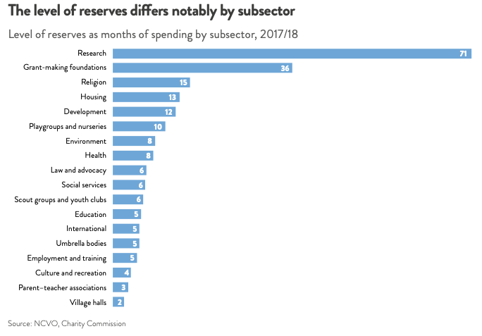 This latter point is taken to suggest that charities should be more financially resilient. However, a more careful look at the data reveals a worrying picture. The chart below shows that the distribution of reserves across the sector is far from uniform, with smaller charities and those in key service sectors such as employment and training, youth work, culture/recreation and social services being among those with the lowest levels of reserves (Village Halls being by far the lowest on average).
